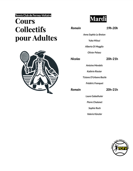 Merci aux membres inscrits aux Cours Collectifs Adulte qui ont déjà payé l’acompte de 75 Euros de bien vouloir procéder au paiement du restant dû (100 Euros), en cliquant sur le lien ci-dessous. A très vite sur les courts !